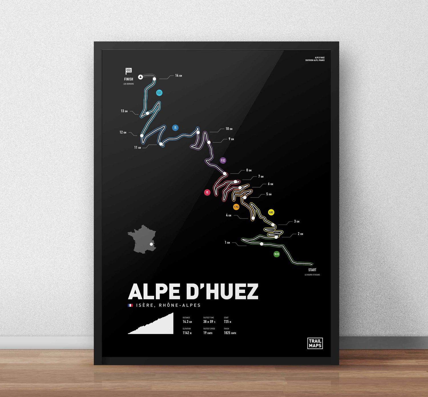 Run by husband and wife team Helen & Aaron trailmaps.com combines years of riding experience with award winning design skills, to create stunning pieces of original artwork to remind you of your favourite journeys and inspire your next one. Choose from our range of mountain bike trails, road cycling climbs, or create your own personalised art print.