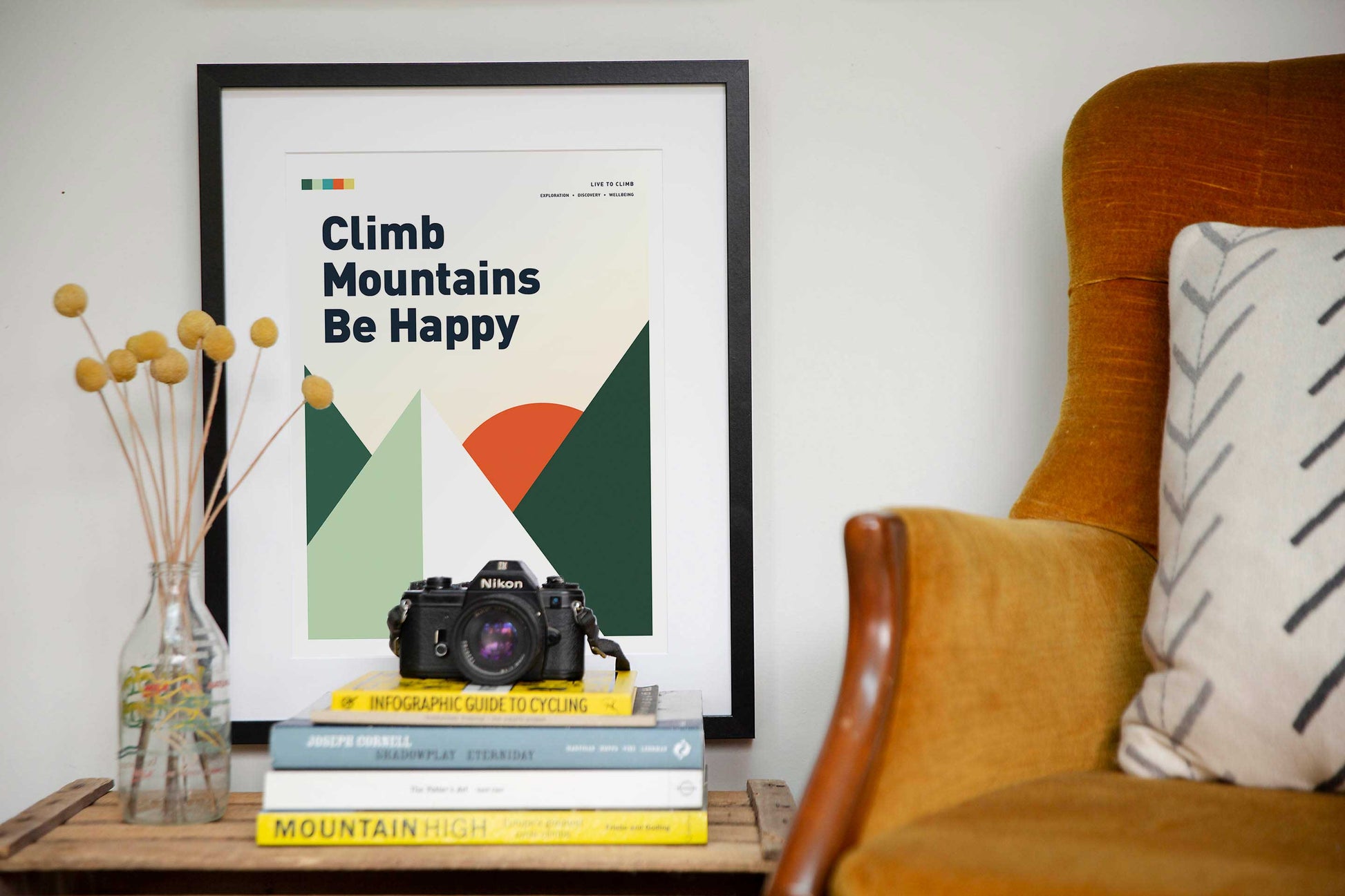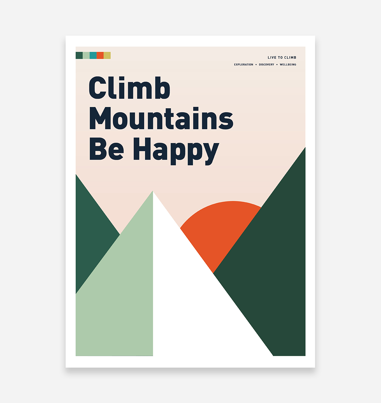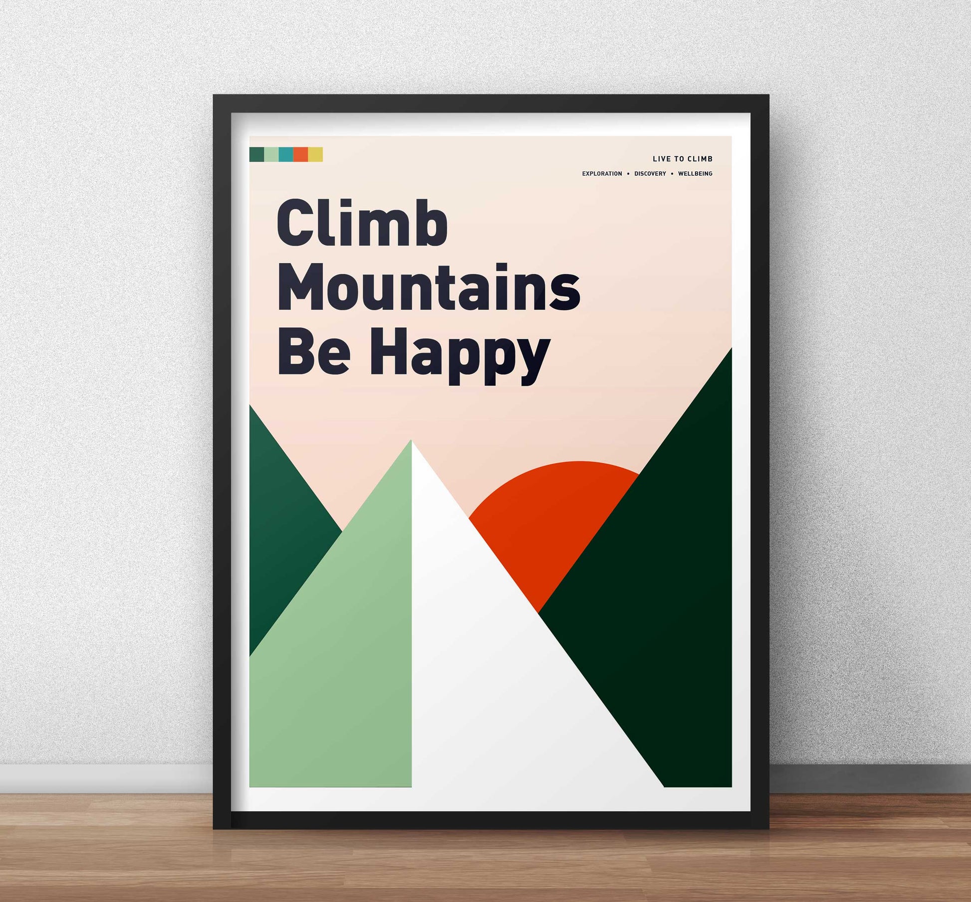 Elevate your space with this stunning art print featuring the inspiring phrase, "Climb Mountains Be Happy." Designed with minimalist geometric shapes, this piece beautifully captures the serene charm of mountains silhouetted against a warm, glowing sunset.