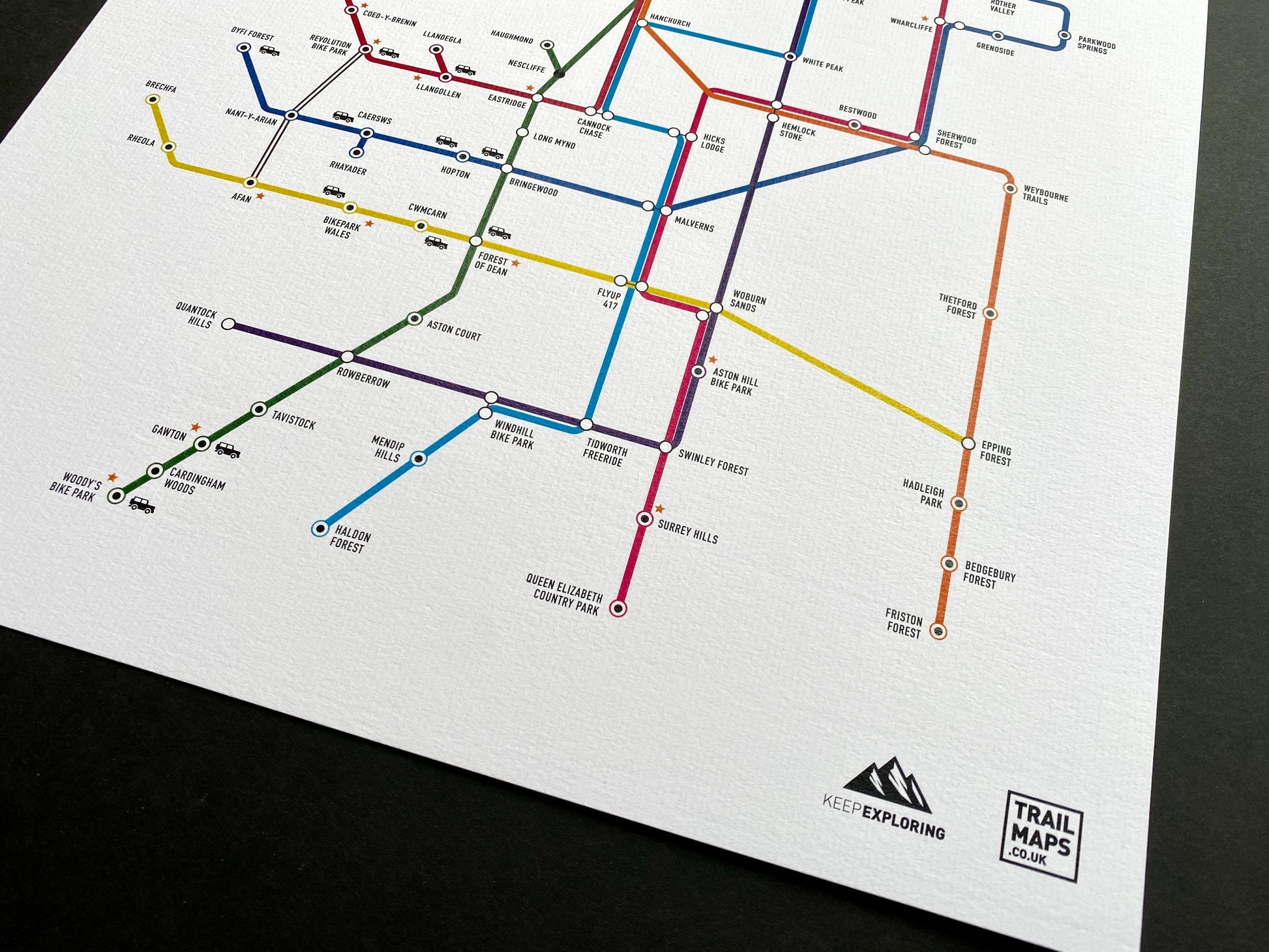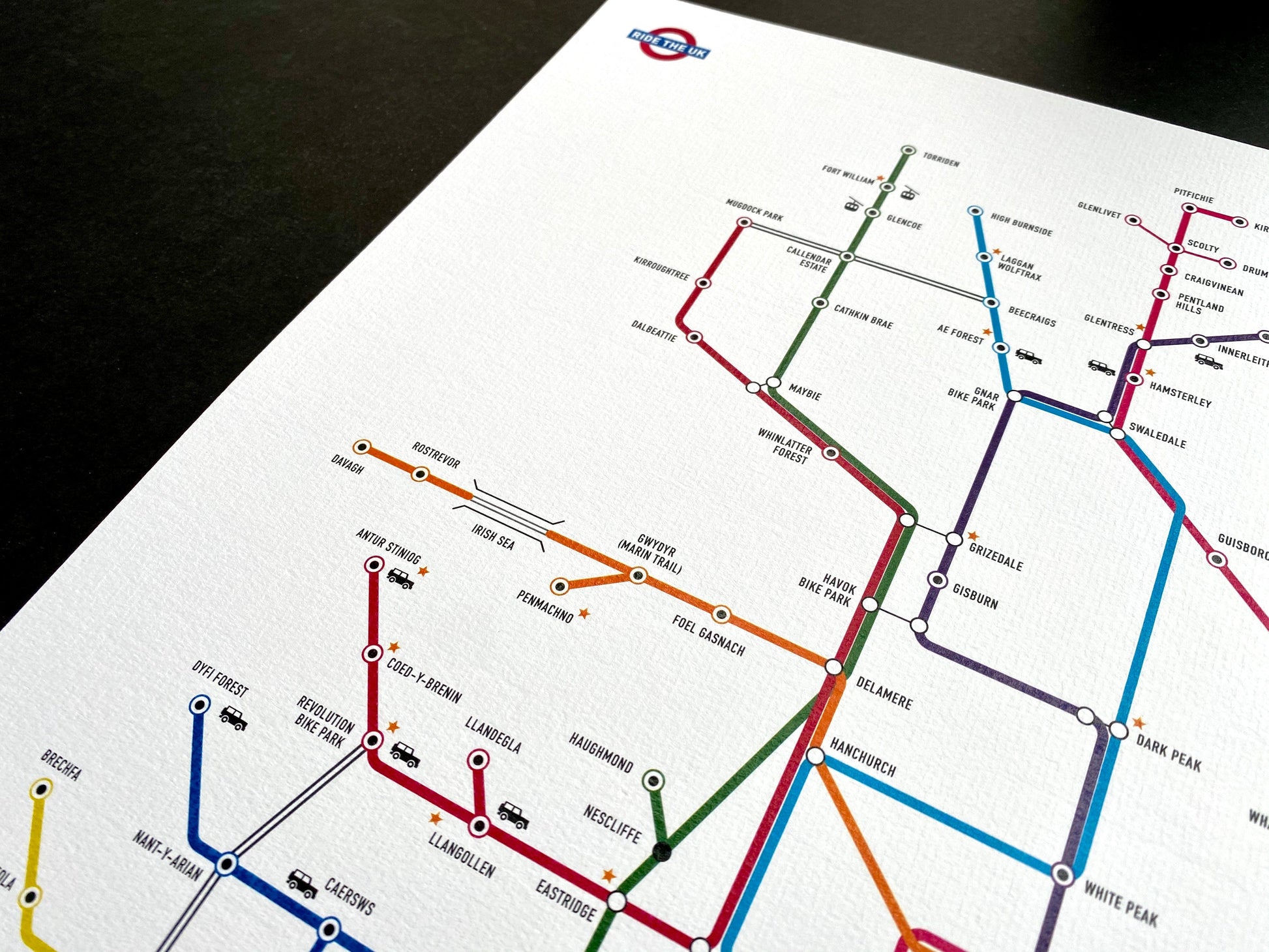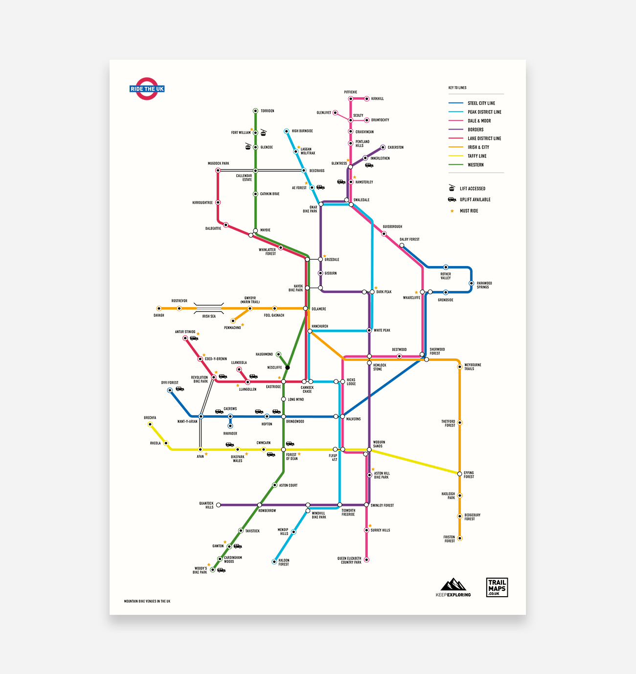 Diese Mountainbike-Karte des Vereinigten Königreichs ist von der Londoner U-Bahn-Karte inspiriert und bietet die besten Orte, um mit dem Fahrrad zu fahren und Ihre Grenzen zu testen. Wir haben mehr als 10 Jahre damit verbracht, das Land zu bereisen und Orte von Glentress bis Gawton zu befahren, und haben unser gesamtes MTB-Wissen in die Schaffung dieses atemberaubenden Kunstwerks für gleichgesinnte Fahrer gesteckt. Inspirieren Sie Ihre nächste Fahrt, perfekt zum Aufhängen im Büro und Träumen vom Wochenende.
