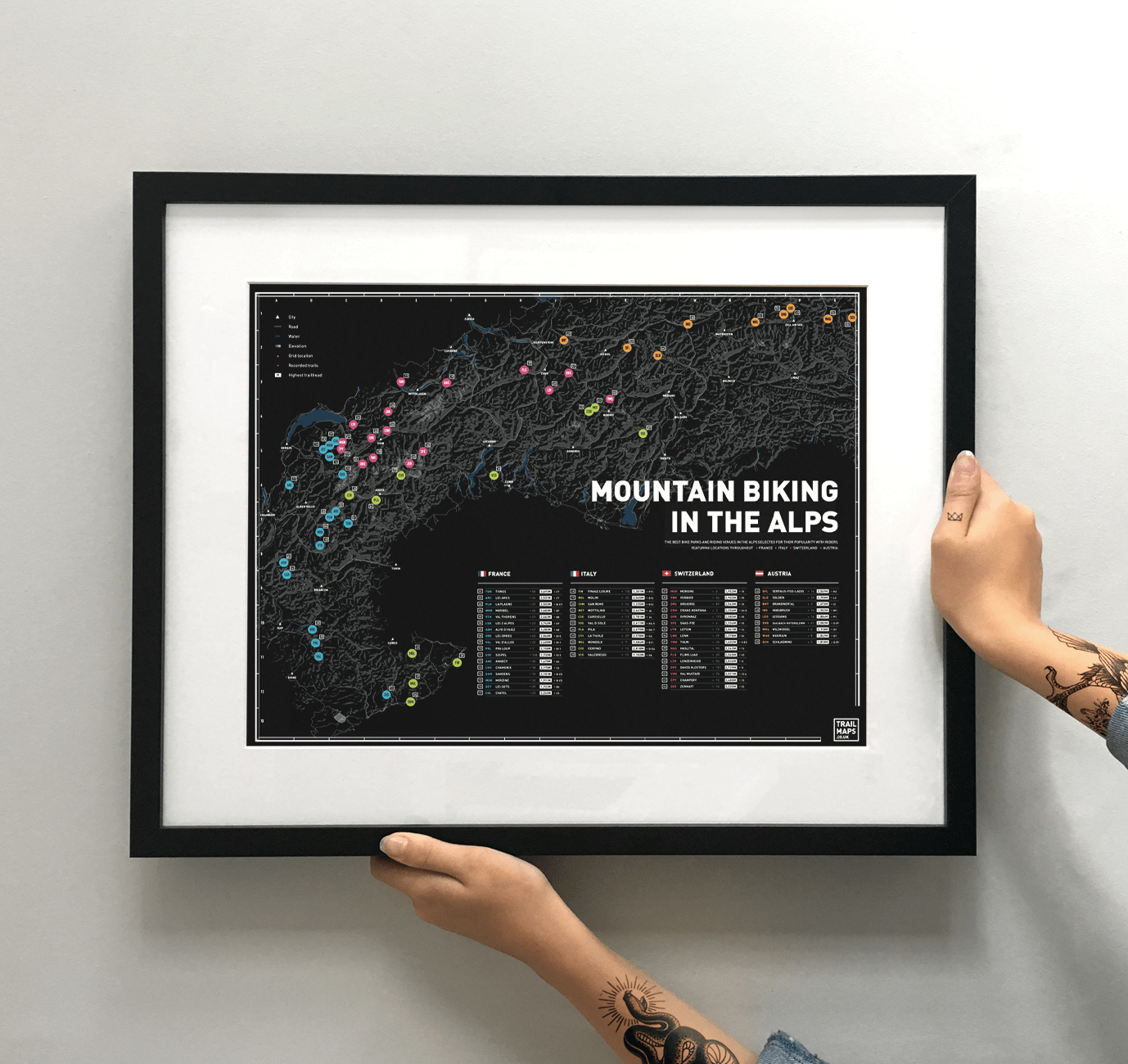 Wir haben unermüdlich die beliebtesten Orte zum Radfahren in den französischen, schweizerischen, italienischen und österreichischen Alpen recherchiert. Jeder Standort ist nummeriert, sodass Sie die Anzahl der Wanderwege, den Standort und die Höhe jedes Gebiets sehen können. Wir zeigen auch Bergtopographie und größere Städte und Städte.