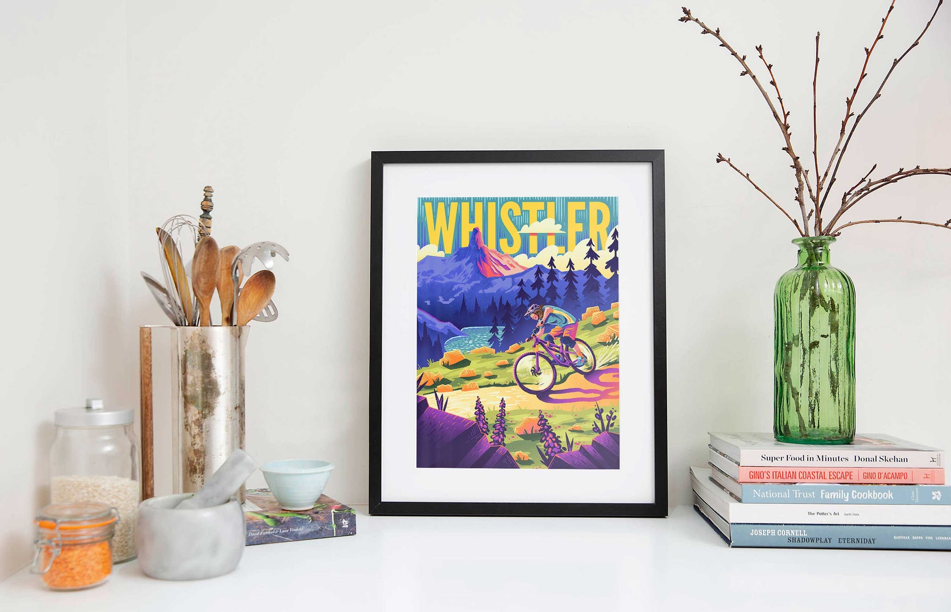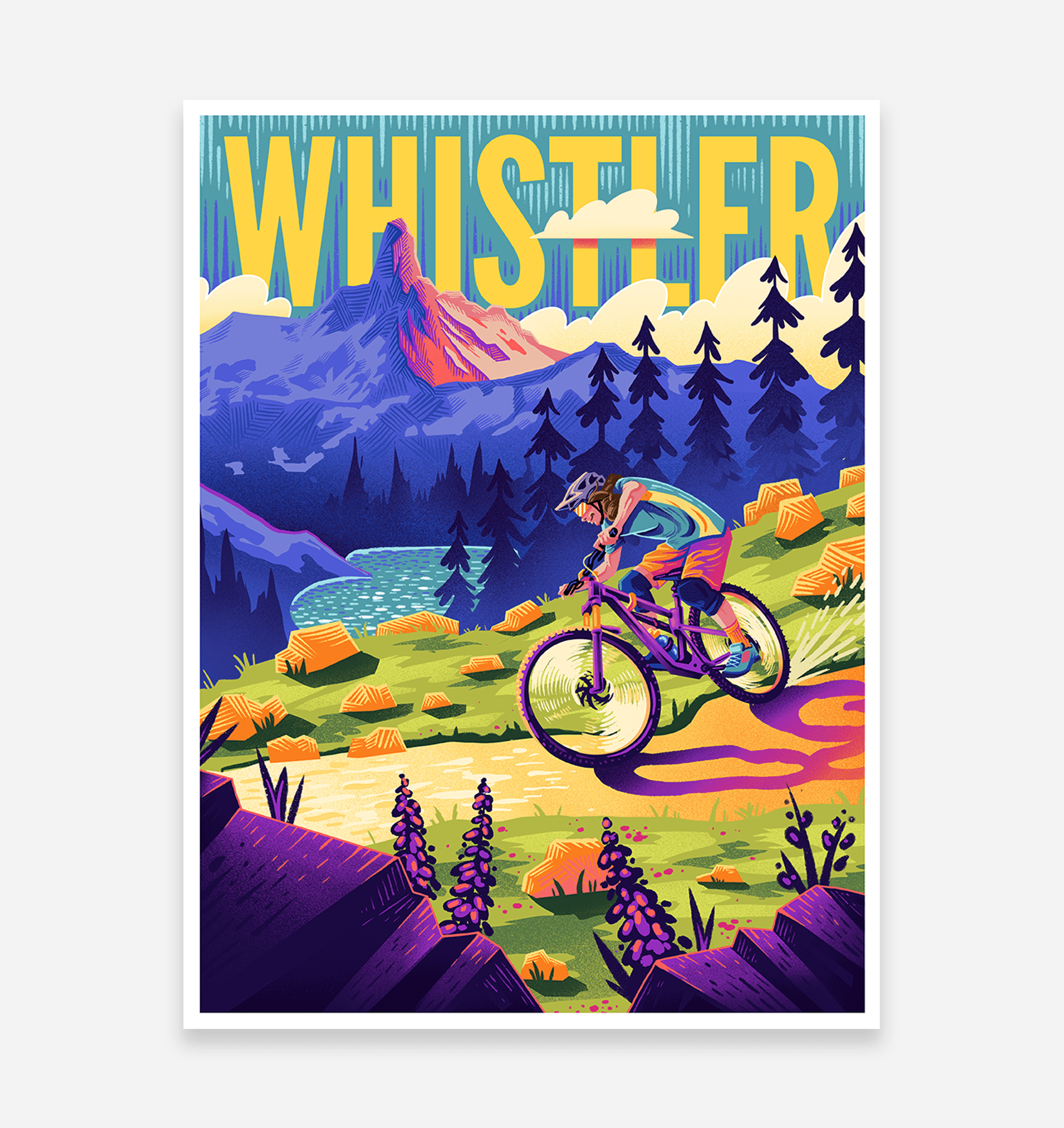 Dieses Mountainbike-Reiseposter von Whistler wurde wunderschön illustriert und fasst alles zusammen, was wir am MTB-Fahren in Kanadas beliebtester Destination lieben.