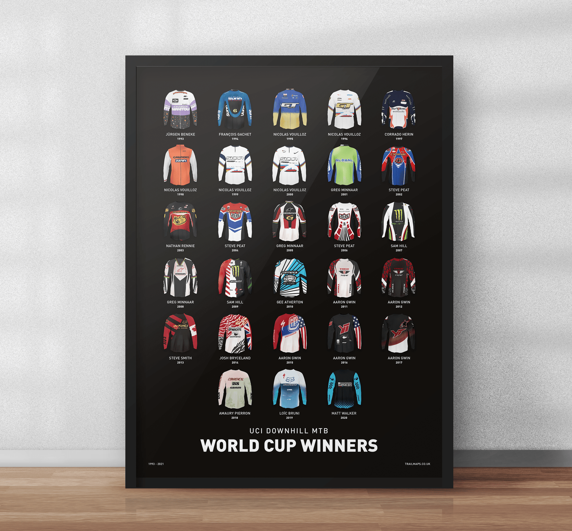 Die Trikots aller Weltcup-Downhill-MTB-Gesamtsieger von 1993 bis 2021, handillustriert.