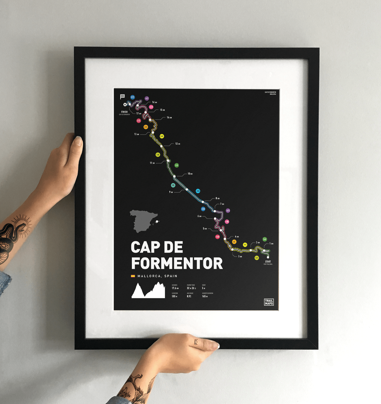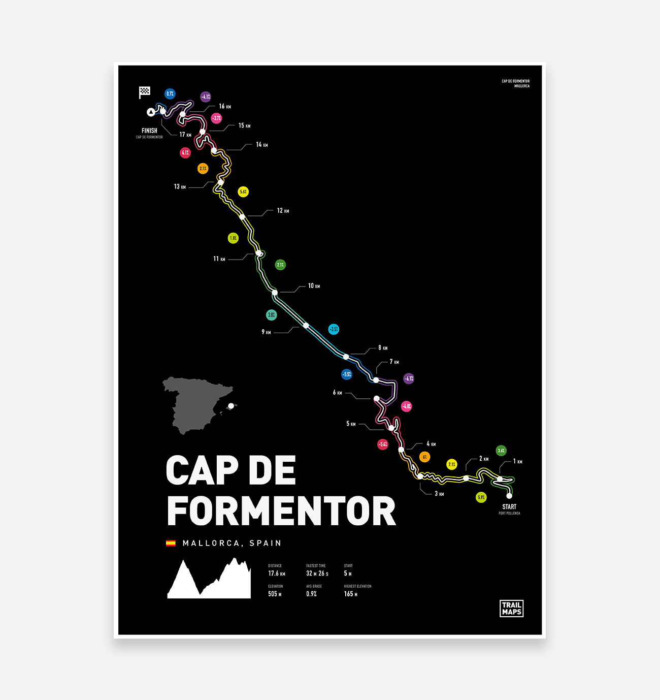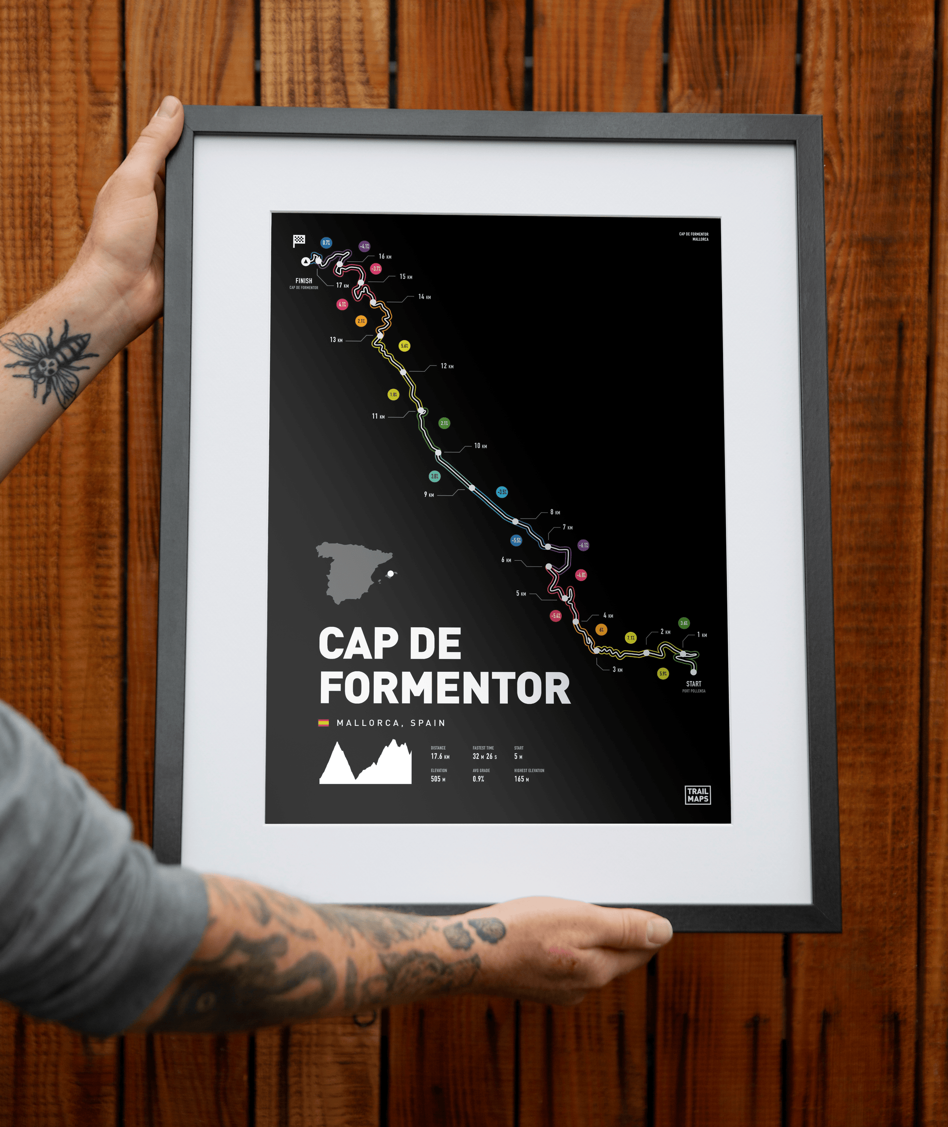 Experience the breathtaking beauty of Mallorca's iconic cycling route with our exclusive infographic art print showcasing the twists and turns of Cap De Formentor.