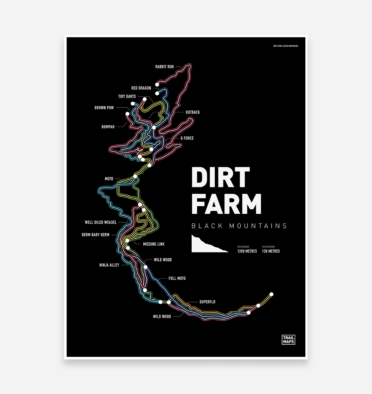 With some of the best jump lines in the UK, the Dirt Farm (previously Black Mountain Cycle Centre) is home to flow, tech and tricks. The TrailMaps print features full top-to-bottom runs, including the trails in between.