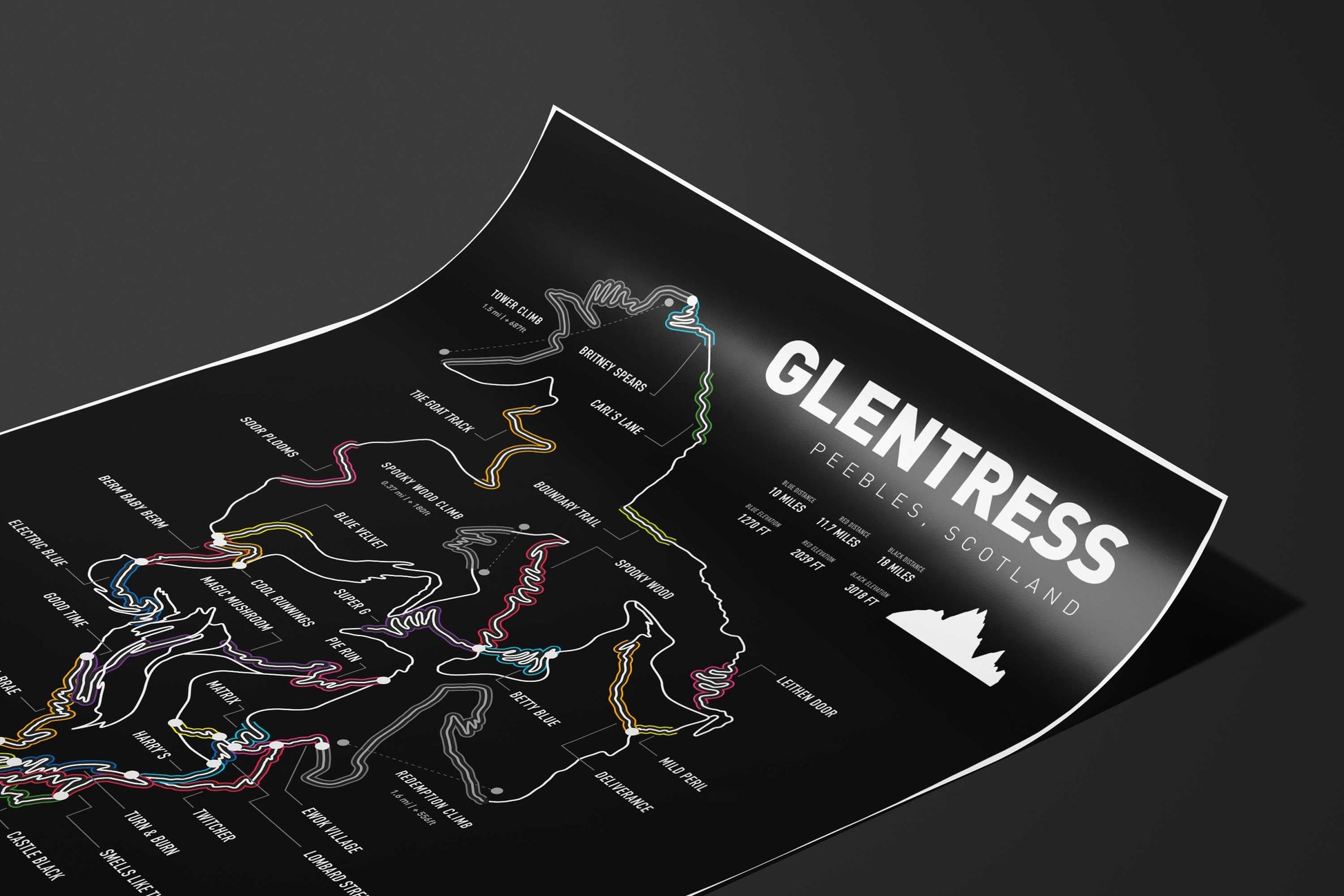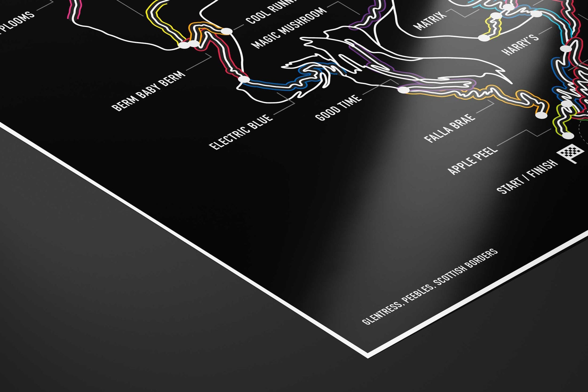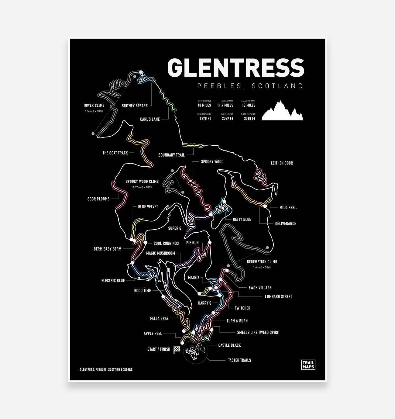 With a network of trails to suit all abilities, steeped in Scottish heritage, there's no wonder why this popular trail centre has worldwide acclaim. The Glentress TrailMap features the iconic Glentress Red, Black and Blue trail routes as well as the new trails Apple Peel, Castle Black, and Smells Like Tweed Spirit.