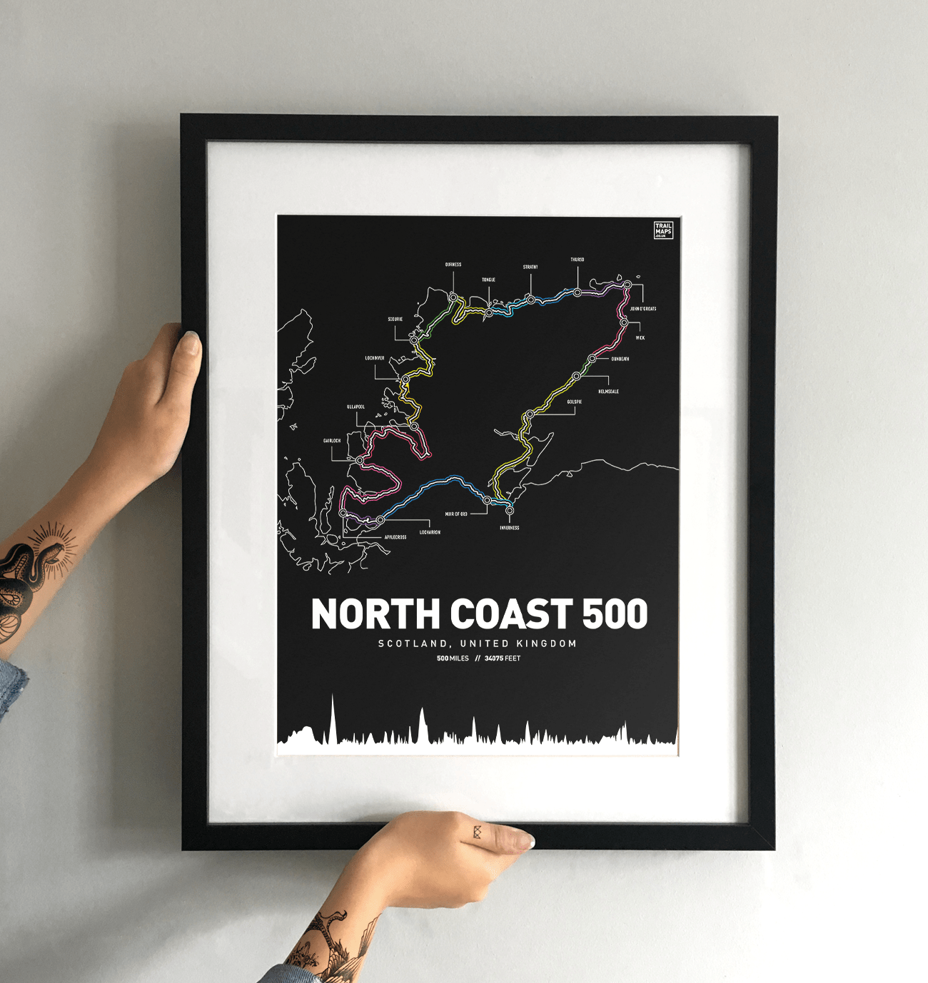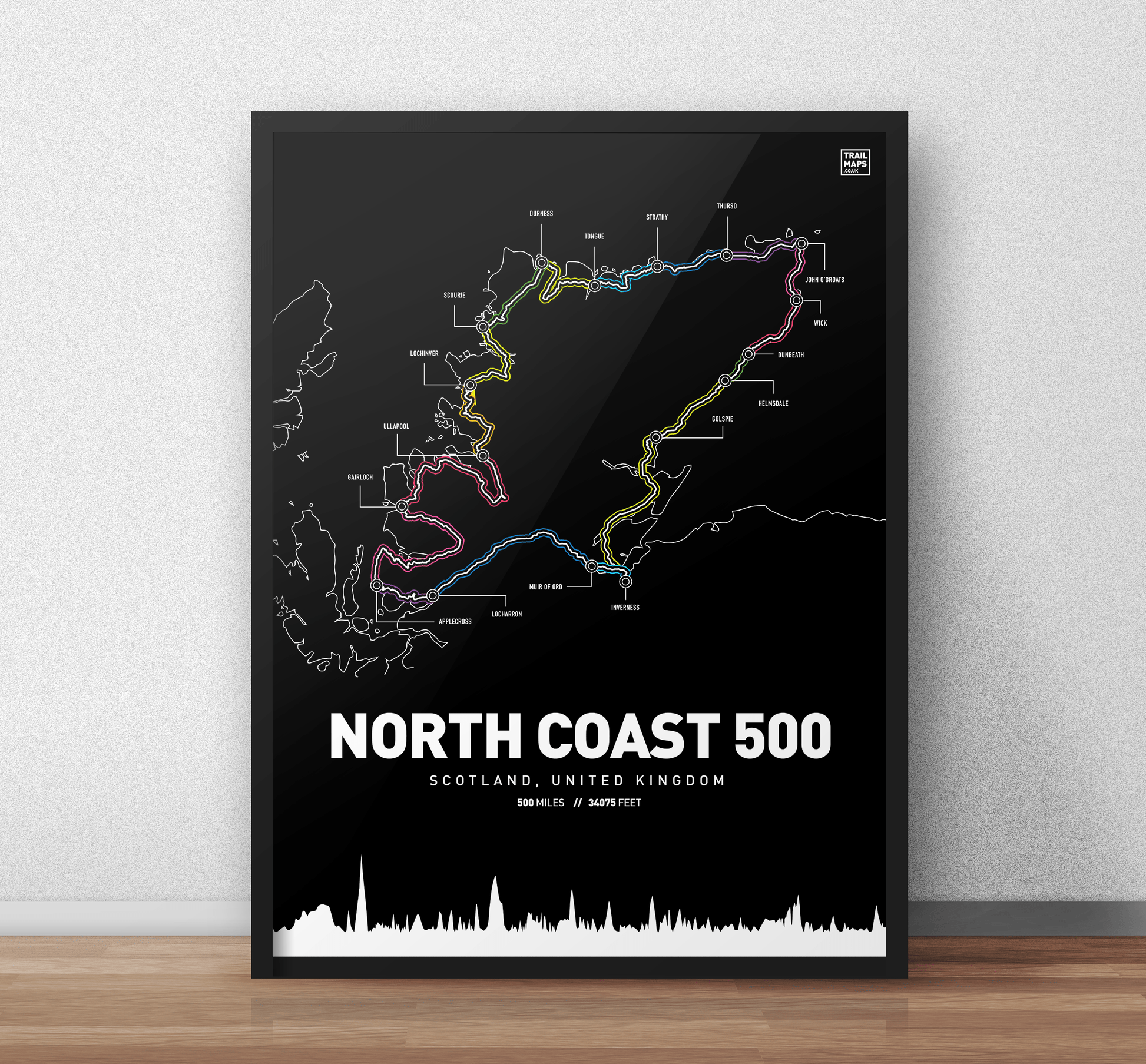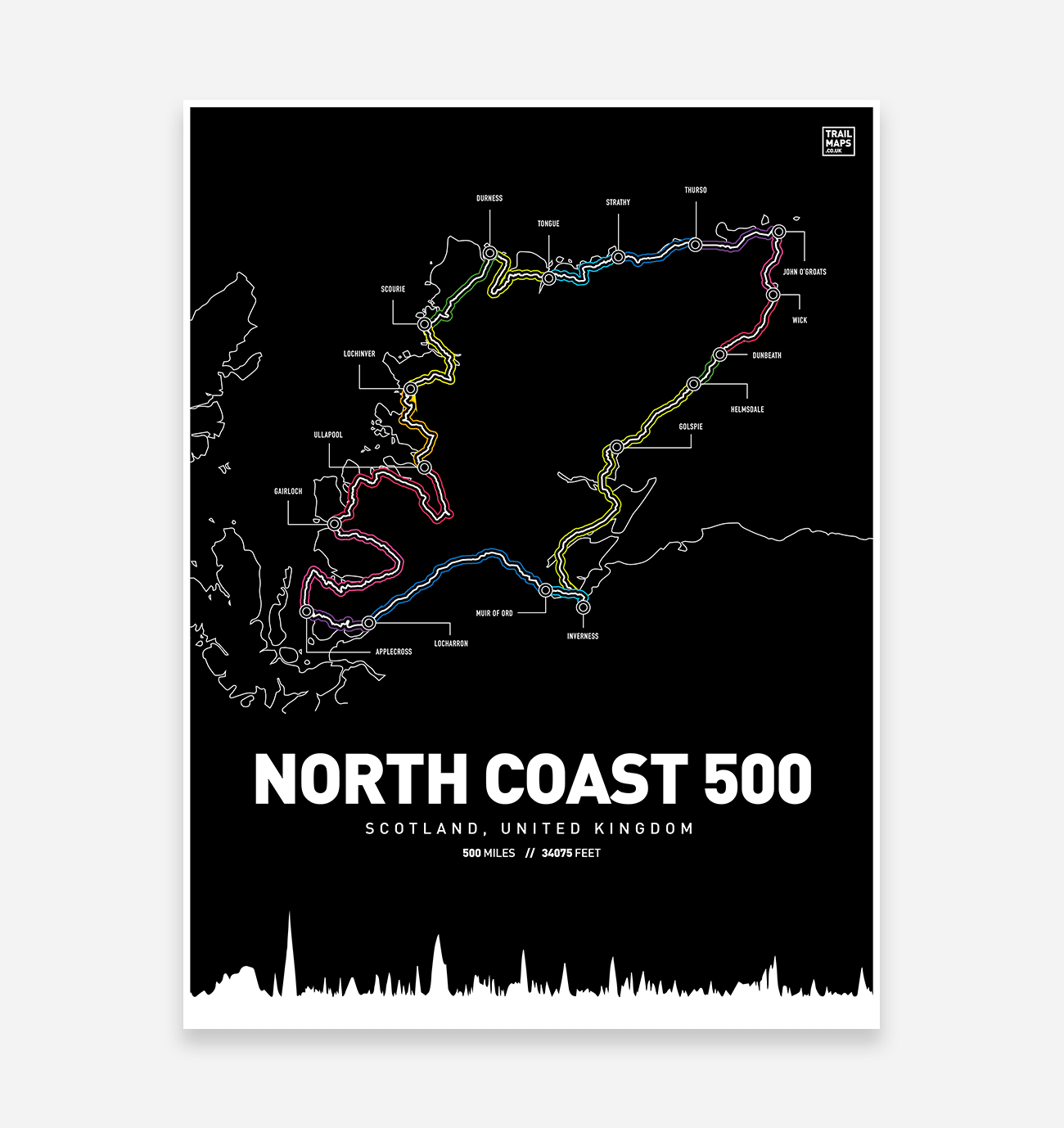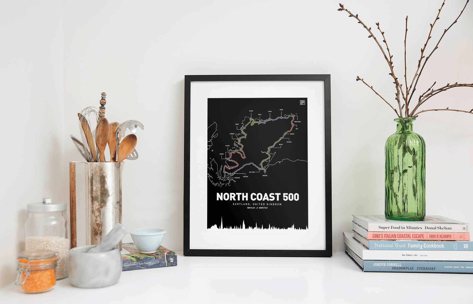 The perfect art print for those who have completed the North Coast 500 in Scotland (the NC500) either on bike, or by driving. It's the ideal route for camper van enthusiasts as well as cyclists.