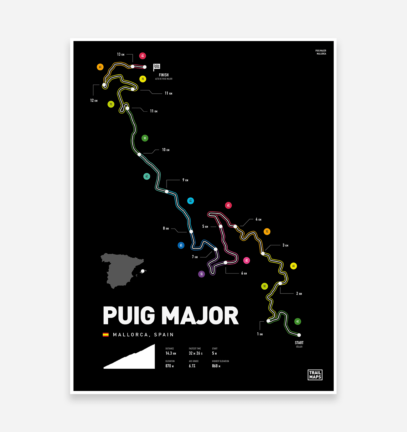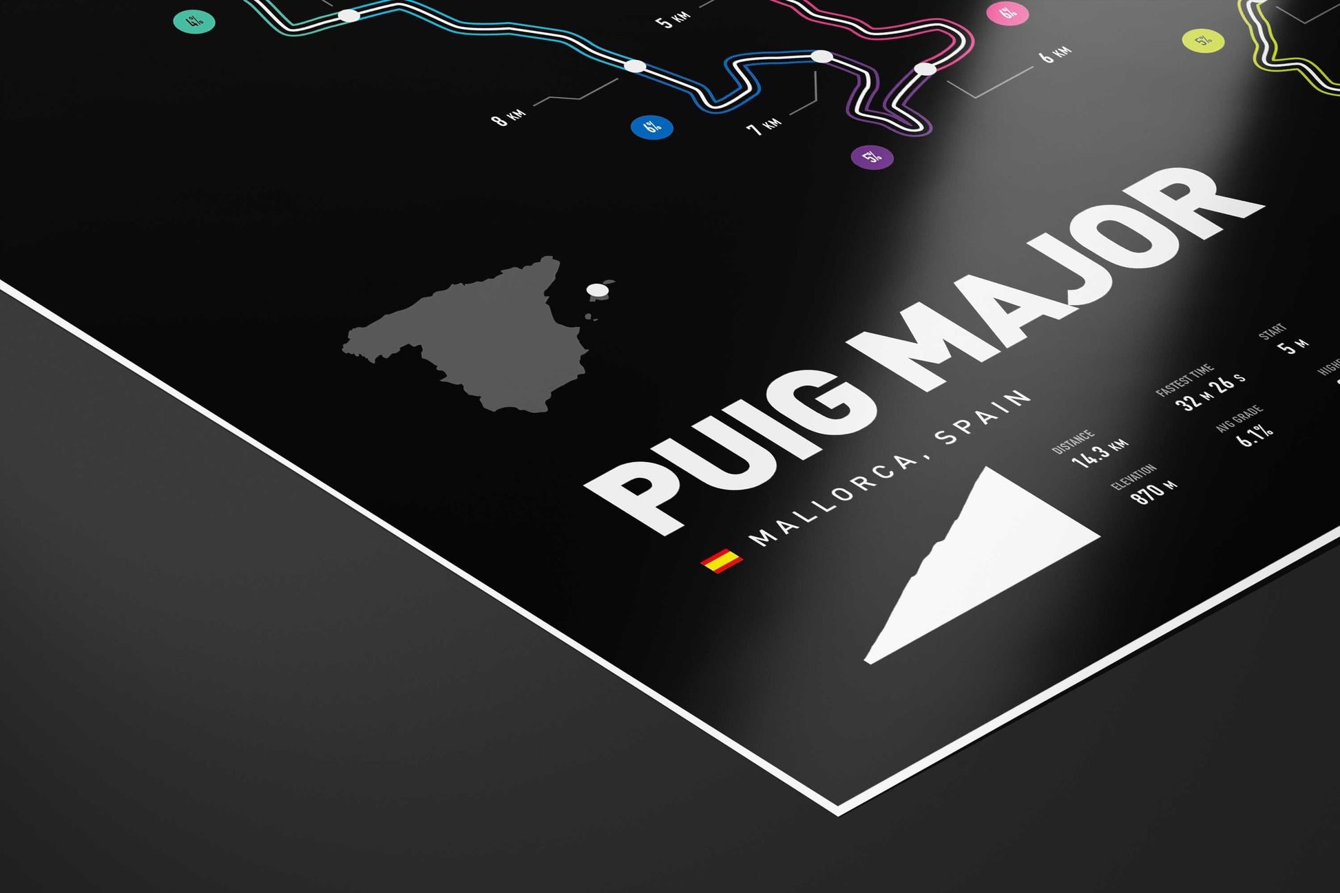 Embark on a visual journey through the legendary ascent of Puig Major in Mallorca with our captivating infographic art print. Featuring intricate details of this iconic road cycling climb, our print is a testament to the thrill and challenge of conquering one of the island's most renowned routes.