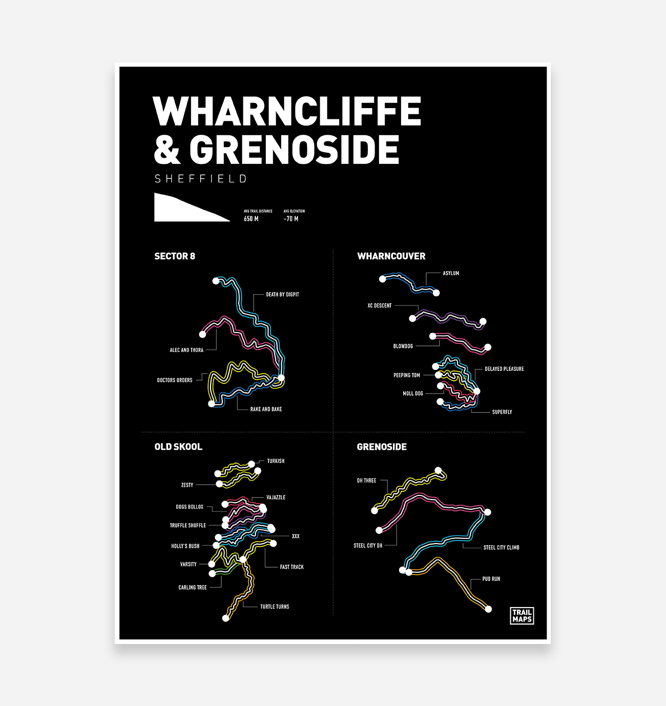 Located near Sheffield, South Yorkshire, Wharncliffe and Grenoside woods are typically adorned with beautiful wildflowers and exhilarating riding. The Wharncliffe TrailMaps features all the short and sweet tracks that make this place a pleasure to ride.