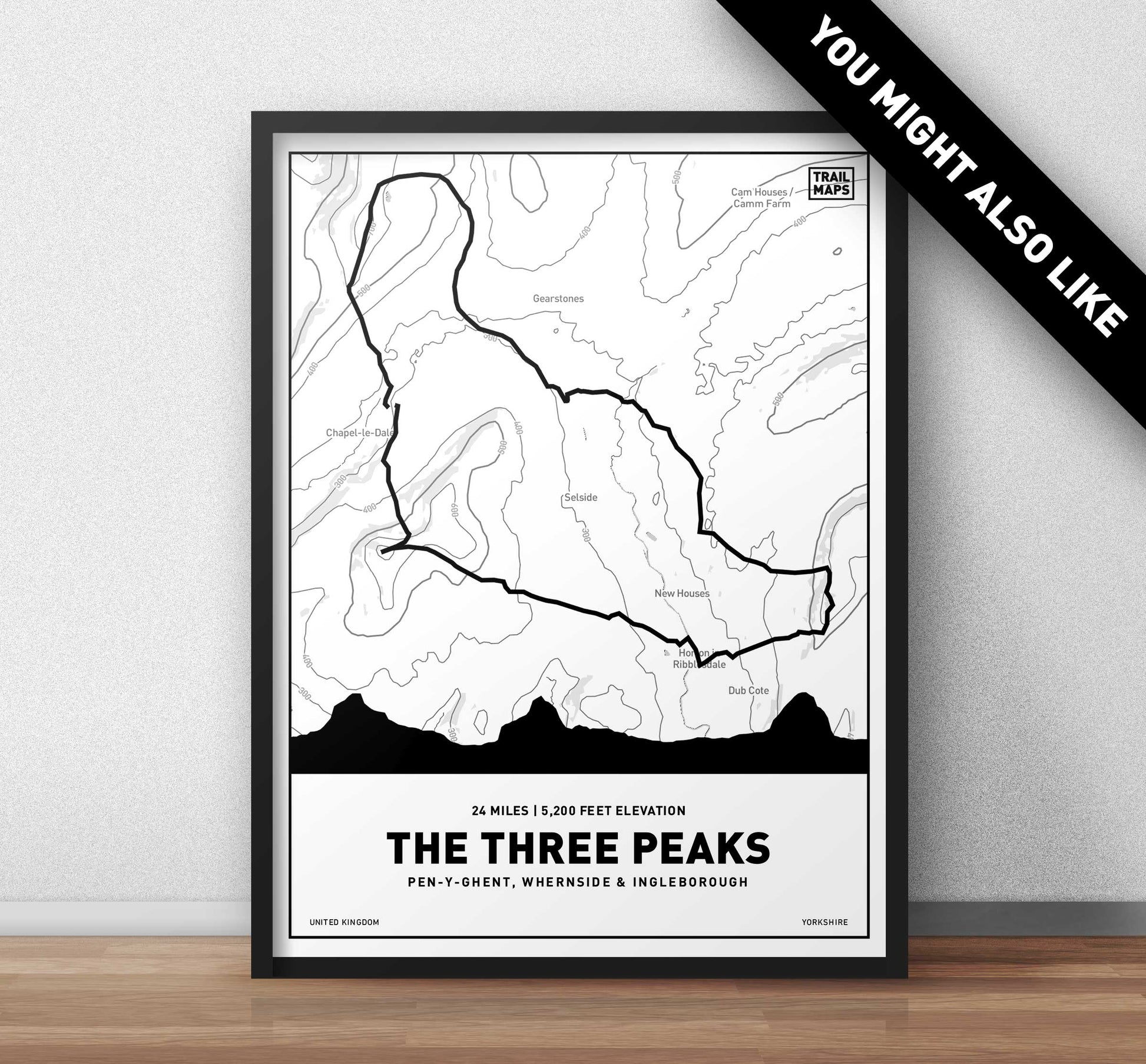 The Yorkshire Three Peaks Challenge is a 24 miles round loop with 5200 feet of climbing. It takes in the peaks of Pen-y-Ghent (694 metres), Whernside (736 metres) and Ingleborough (723 metres), usually in this order and usually starts in Chapel le Dale. Available in both black and white.